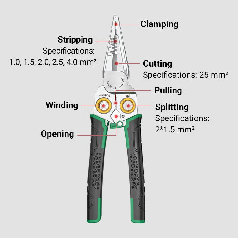 MULTI-TOOL FUNCTIONALITY: Includes wire stripping, winding, opening, clamping, cutting ,splitting capabilities. Compact design integrates multiple functions for convenience.