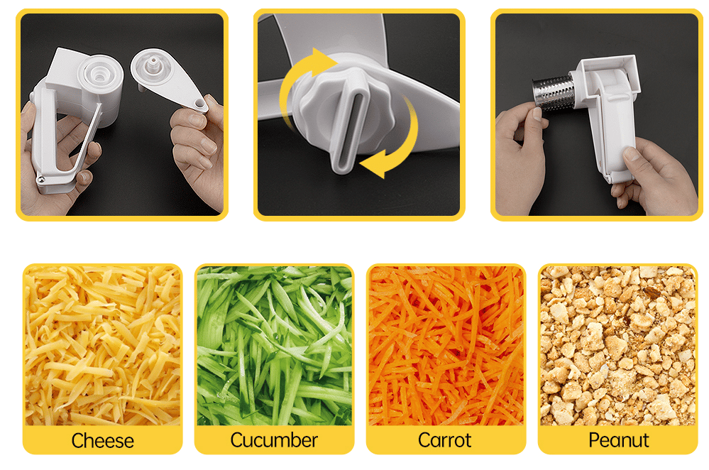 🧀Just put the food into the cheese grater with handle, press lightly on it, and turn the handle to shred the food easily.