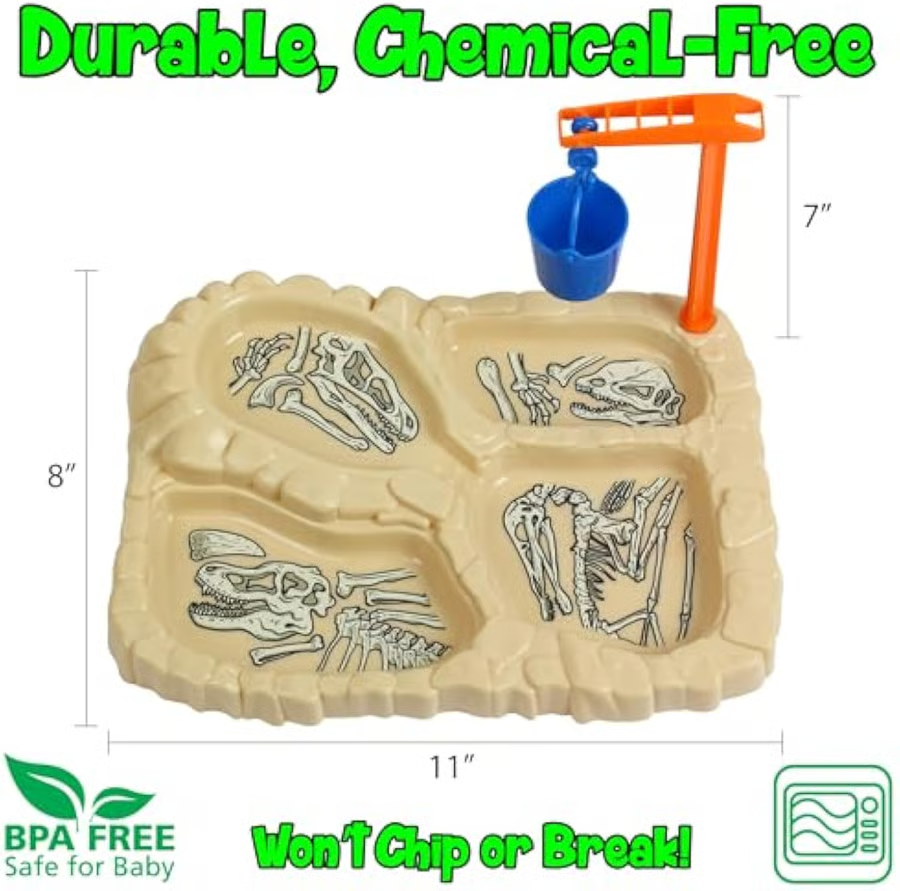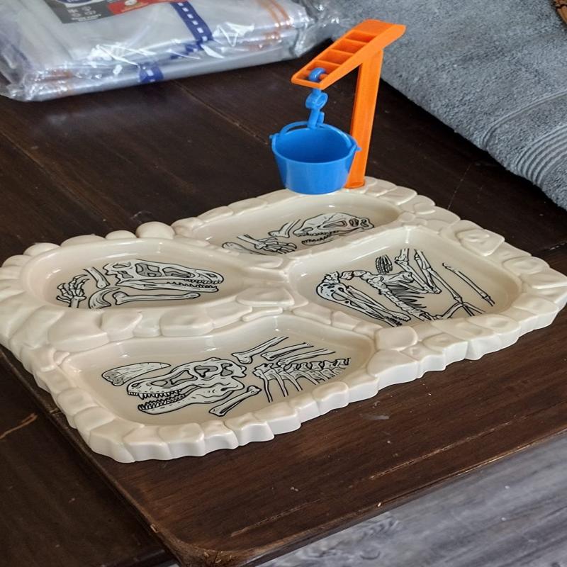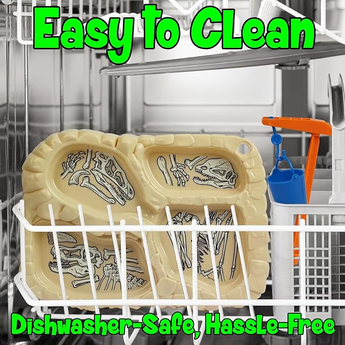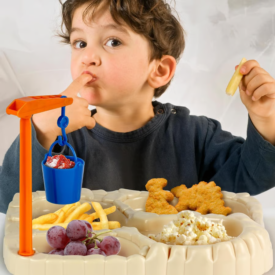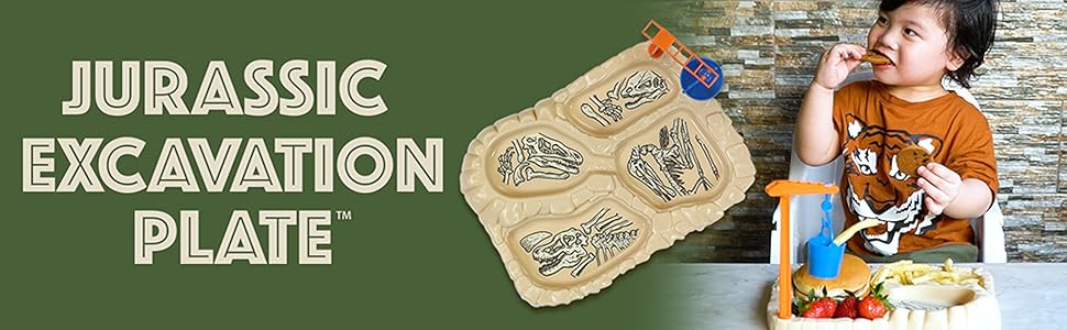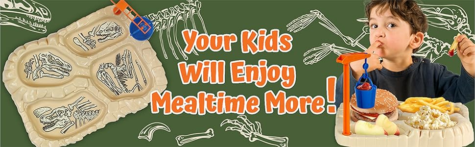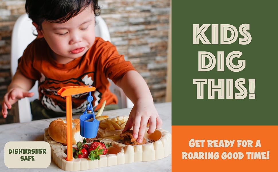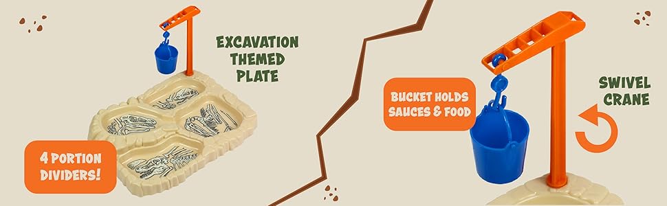DIG INTO THE PREHISTORIC: Unearth a Jurassic feast with our Dinosaur Themed Jurassic Excavation Plate! With each bite, your little paleontologist excavates closer to the dinosaur bones imprinted on the plate. The movable crane serves as a fun tool for saucing up their discoveries, making each meal a playful excavation. It's a dino-mite adventure on a plate, where ketchup flows like lava and veggies unearth ancient secrets!
